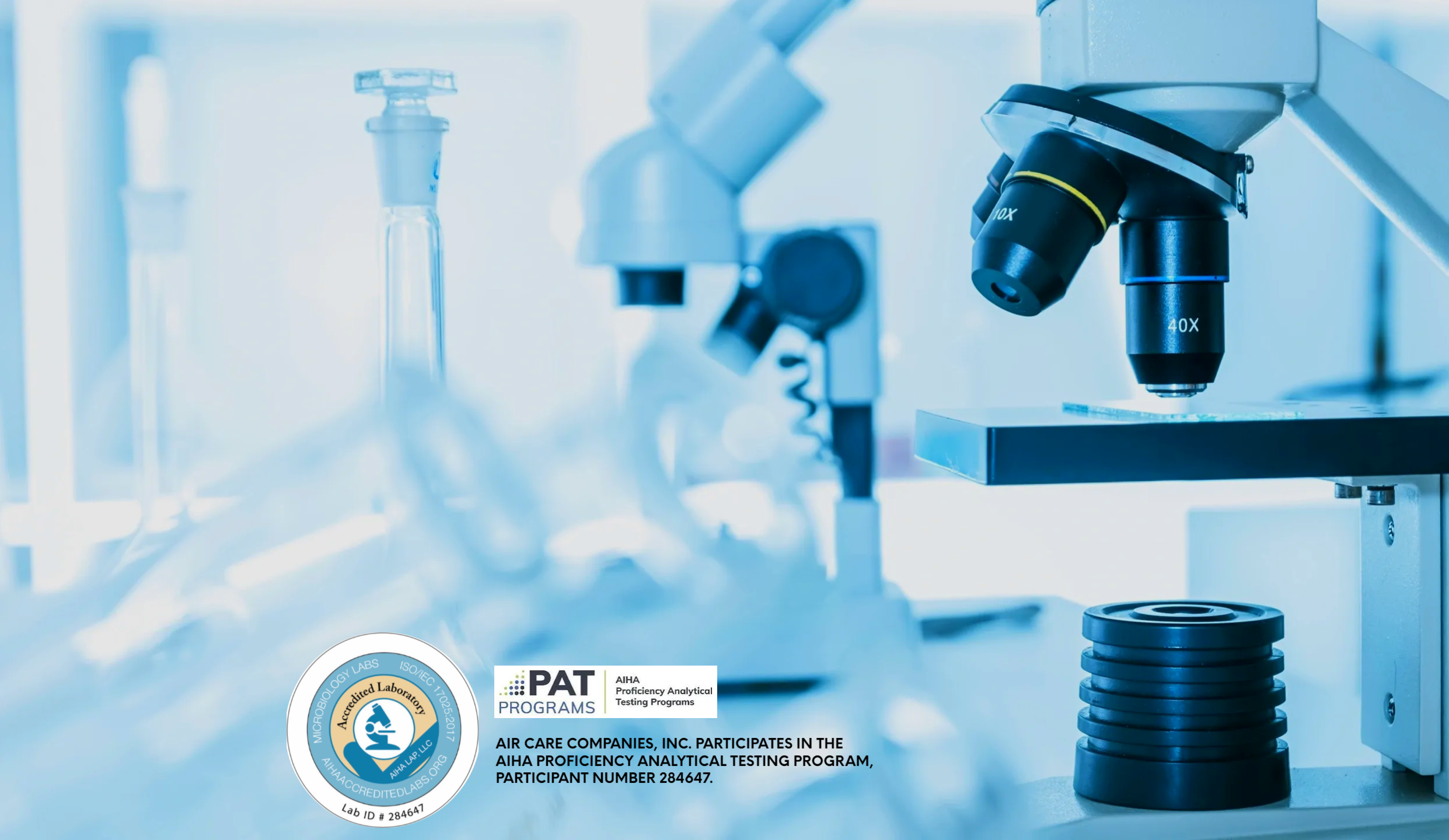 Air Care Companies, Inc. is microbiology laboratory accredited by the American Industrial Hygiene Association Laboratory Accreditation Programs (AIHA LAP), LAP-284647 and participates in the AIHA Environmental Microbiology Proficiency Analytical Testing (EMPAT) Program.